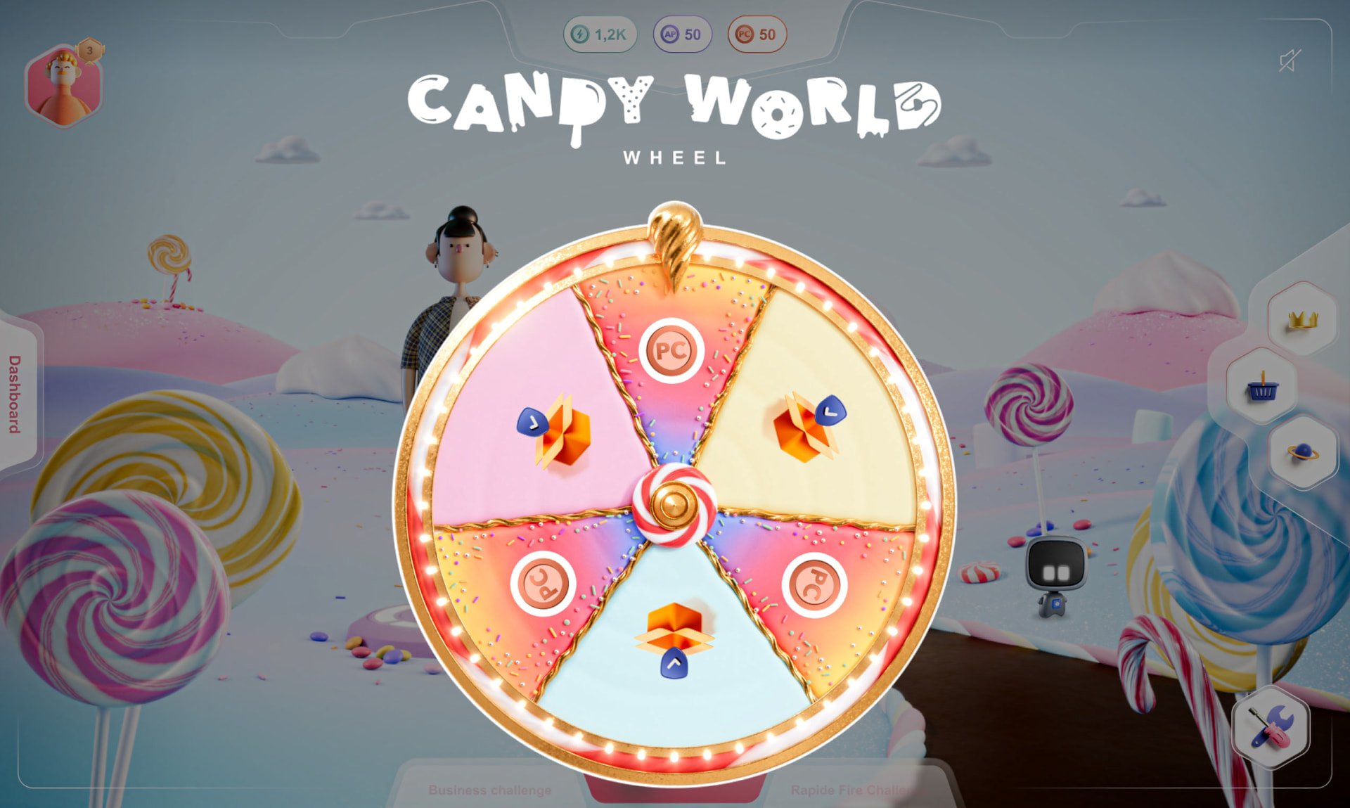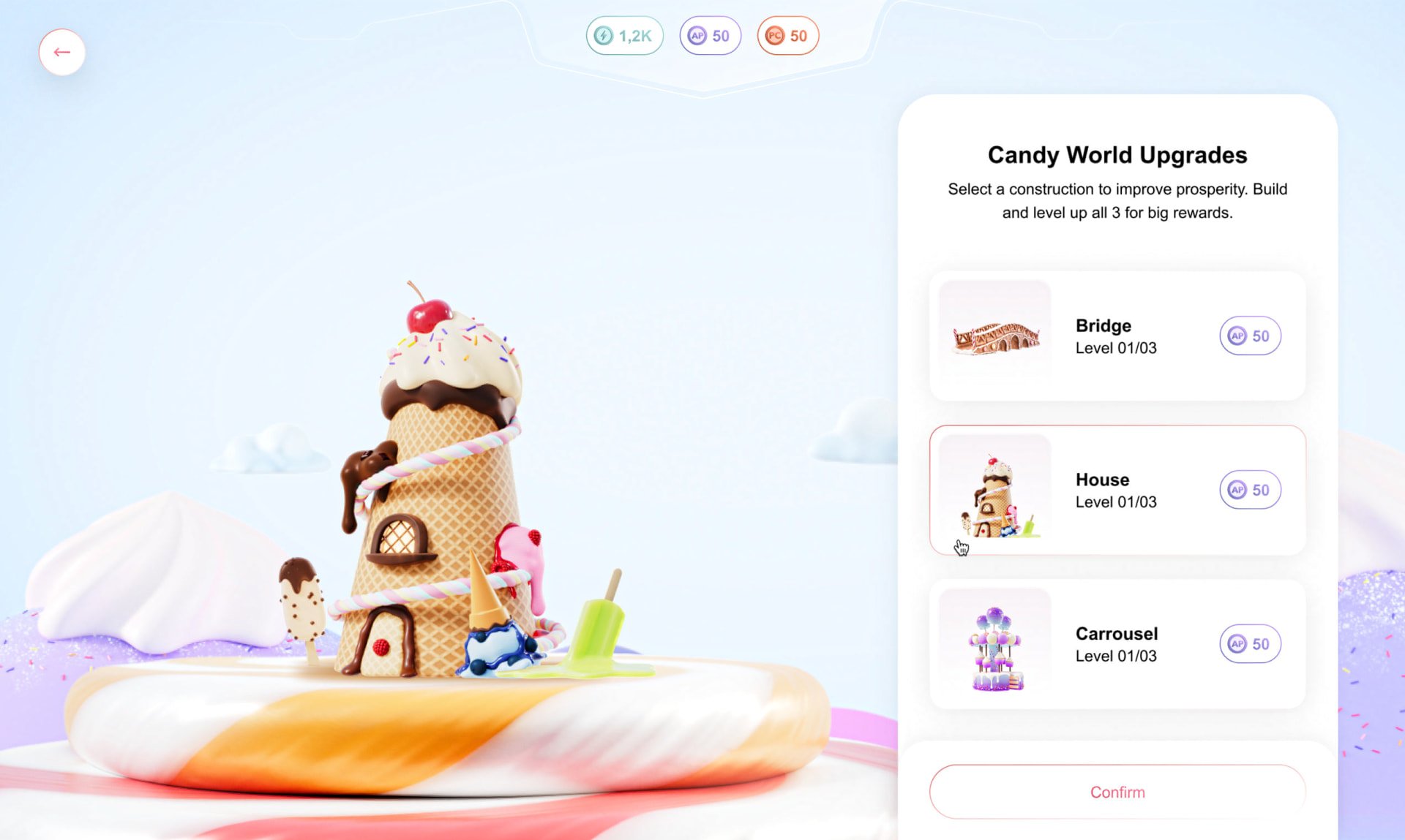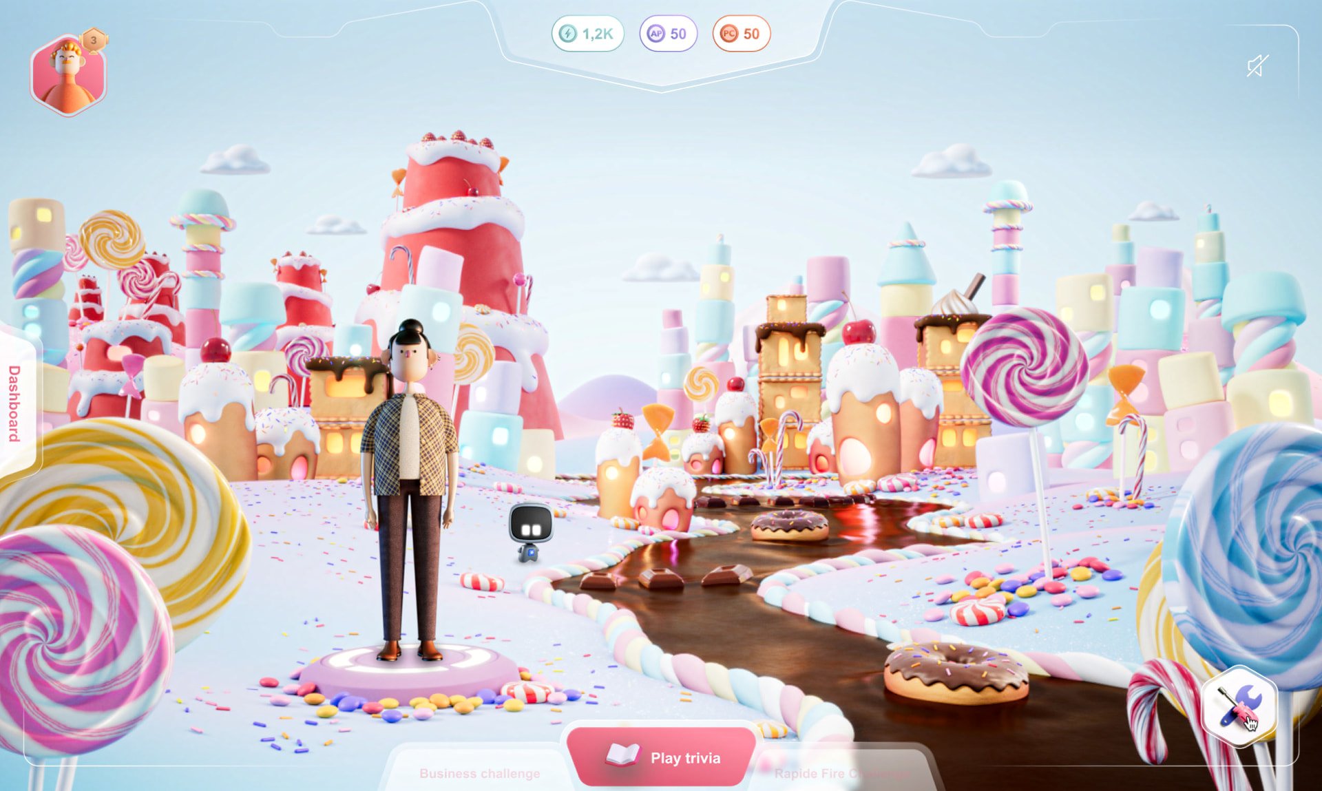 Our design system is tailored to adapt seamlessly to both "Candy World" and "Lost World," ensuring consistent UI with color changes: pink for Candy and green for Lost World. Gamification, driven by the collaboration of the design and 3D teams, enhances engagement through level progression, new challenges, and collectible rewards, encouraging players to customize their worlds and avatars. A competitive ranking system adds an extra layer of motivation, fostering continuous improvement and friendly competition.